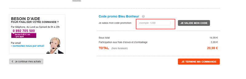 - 4, Sur la page de paiement, vous verrez une boîte «Code promo Bleu Bonheur. Je saisis mon code promotion».