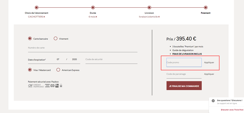 Trois Fois Vin est une boutique en ligne qui propose les box de vin dont l'achat est effectif après un abonnement mensuel. Depuis presque 20 ans, Marie-Dominique Bradford , une dégustatrice confirmée qui compte à son actif une vingtaine d’années d’expérience. elle milite pour l'excellence. Elle revendique un goût prononcé pour les vins d'artisans-vignerons et déniche ceux qui méritent de faire partie des grands. Professeur d'oenologie et exportatrice de vins français, elle a créé Trois Fois Vin en 2010.De nombreuses réduction et remises qu'ils proposent, les codes promo Trois Fois Vin sont également fournis, vous pouvez utiliser un code promo pendant le paiement de votre panier d'achat et obtenez des remises immédiates.